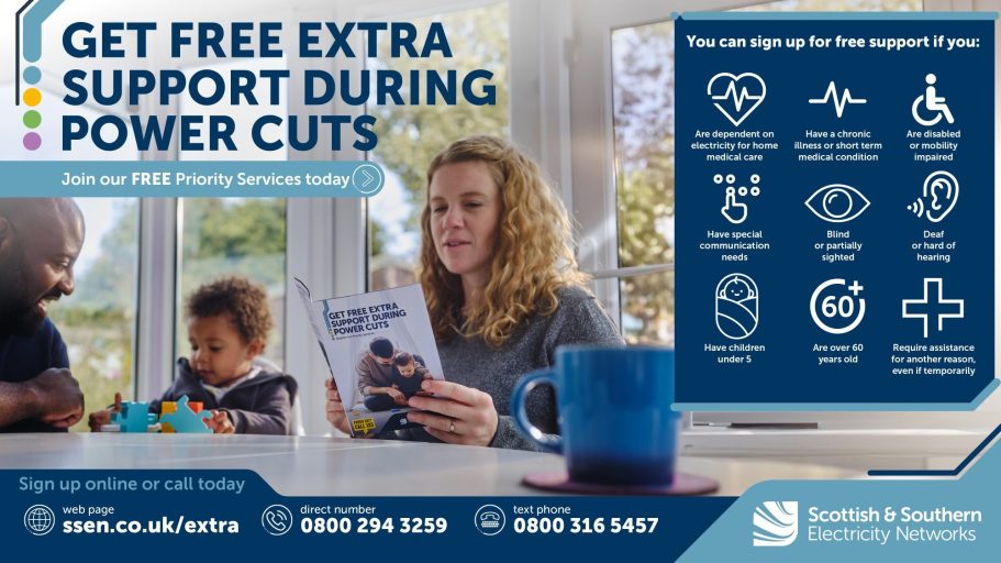 By signing up to SSEN’s free Priority Services Register you can access extra support during a power cut. SSEN’s free Priority Services Register supports those with chronic illnesses, mental health, young children and more. The dedicated Priority Services line is available 24 hours a day.